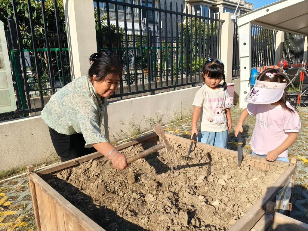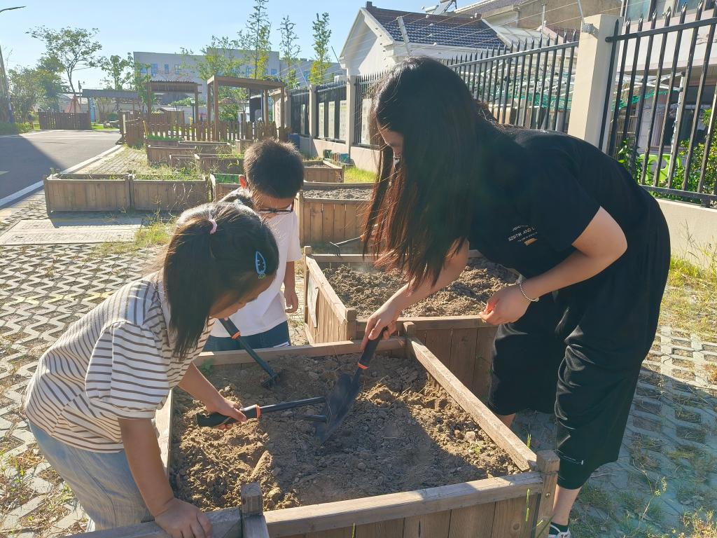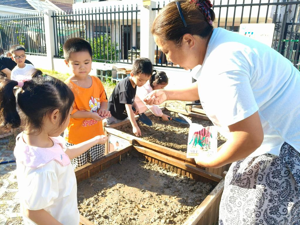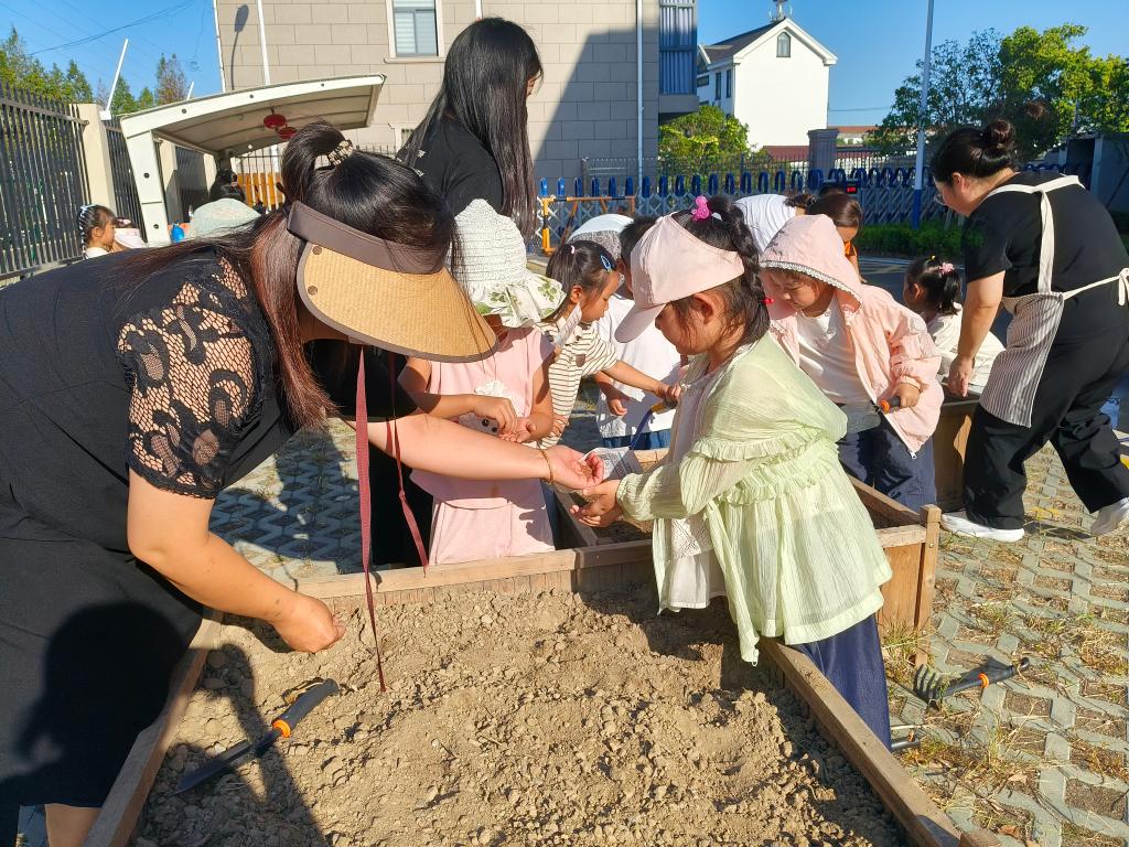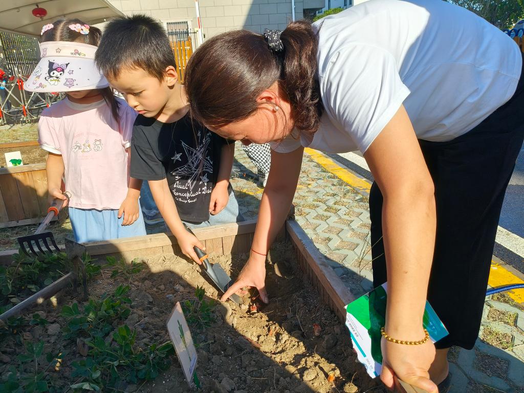 为让幼儿亲近自然、感受劳动乐趣,同时搭建家园共育桥梁,我班于10月9日下午在幼儿园“一米菜园”开展了主题为“小手拉大手,共种一片绿”的亲子蔬菜种植活动。活动前征集的5位有种植经验的家长,化身“种植小导师”,现场示范翻土、挖坑、栽苗、浇水的完整流程。他们结合自身经验,用通俗的语言讲解关键技巧——比如“翻土要轻,别伤到土壤里的小虫子”“浇水要浇透根部,像给小秧苗喝饱水”,还手把手指导幼儿,让原本陌生的种植步骤变得清晰易懂。