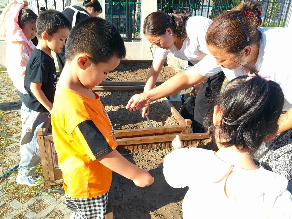 在家长的带领下,幼儿主动参与递铲子、扶秧苗、浇小水等环节,这种沉浸式体验不仅让幼儿学会了基础种植方法,更培养了责任意识。