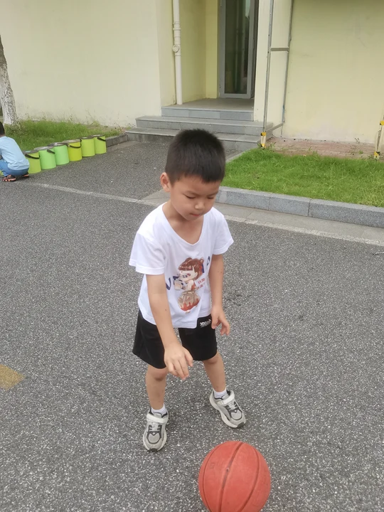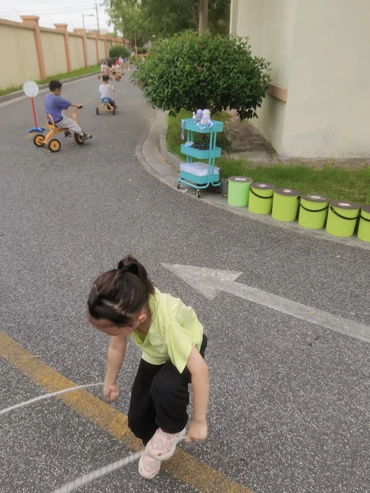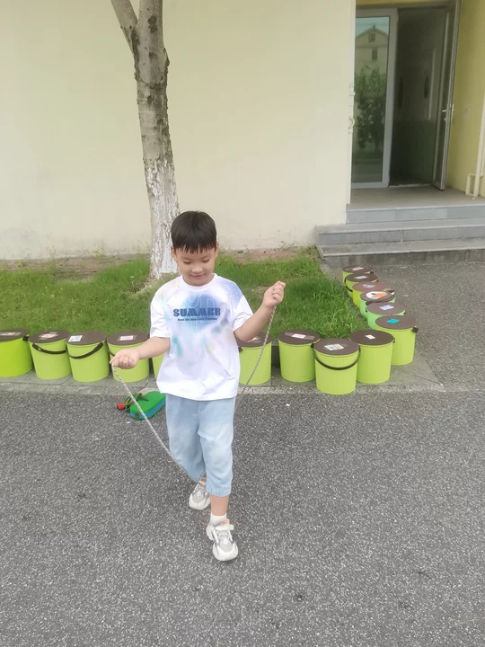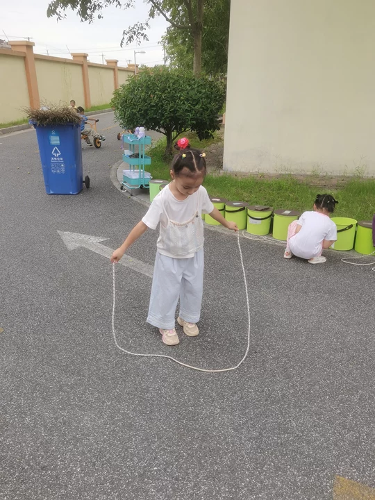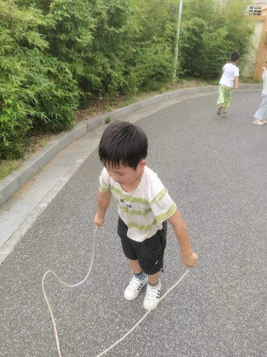 宝贝双手向前平伸,慢慢甩绳子,然后双脚并拢起跳,一个接一个地在空地上跳绳,越练习跳得越快,感受到锻炼的快乐。